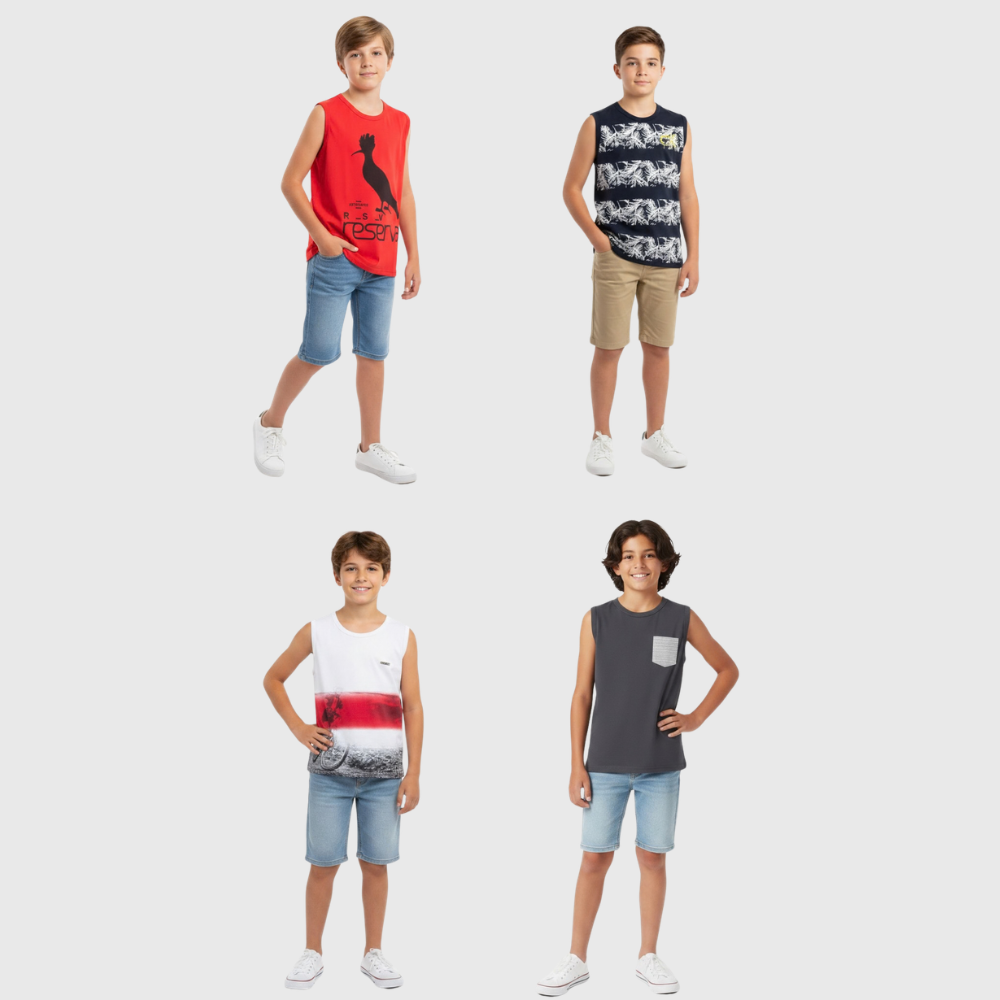 Regata juvenil sortida, peça leve e versátil que não pode faltar no mix da loja. Ideal para lojistas que buscam variedade e produtos com excelente saída no varejo juvenil, facilitando combinações e aumentando o giro no ponto de venda.